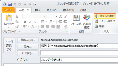 Outlookでは、メール作成画面の「挿入」メニューから「ファイルの添付」を選び、対象ファイルを選択します。