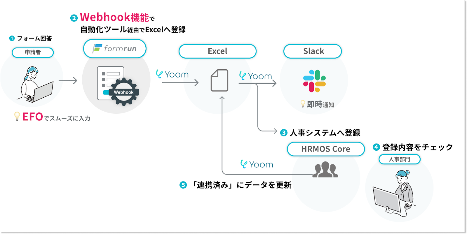 Webhook:フォームからの入力内容をyoomで成形し、HRMOSに連携。現在はExcel経由の一時処理を行いながら、9月の本格運用に向けて準備中です。