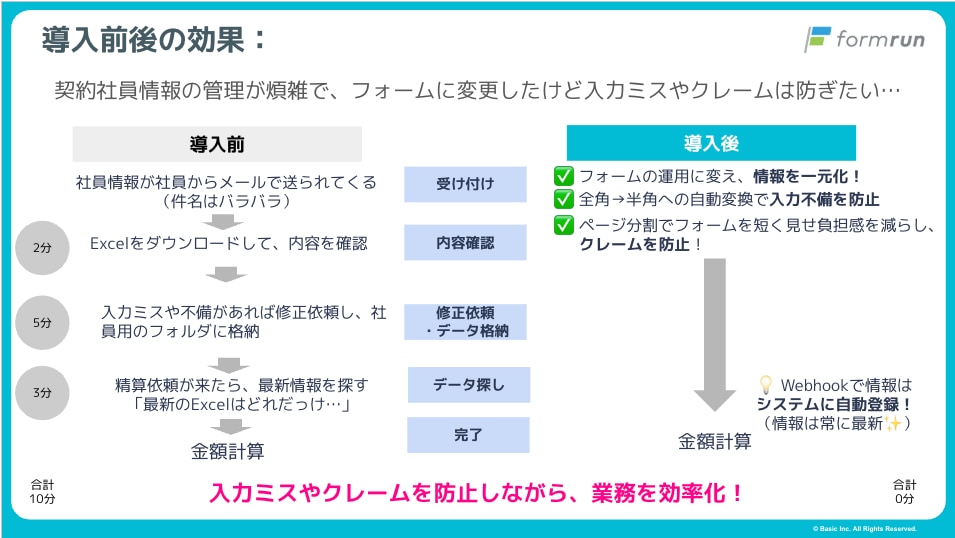 また、formrunなら、Microsoft Formsでは難しい分岐設定もできますし、Webhookによる柔軟な外部システム連携で「業務自動化の入口」として業務フロー全体を効率化できる点も大きな魅力です。