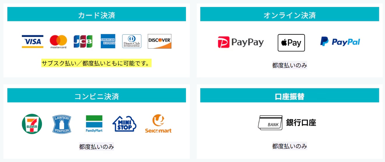 しかも、決済の方法は幅広く以下のような決済方法が使用できます。