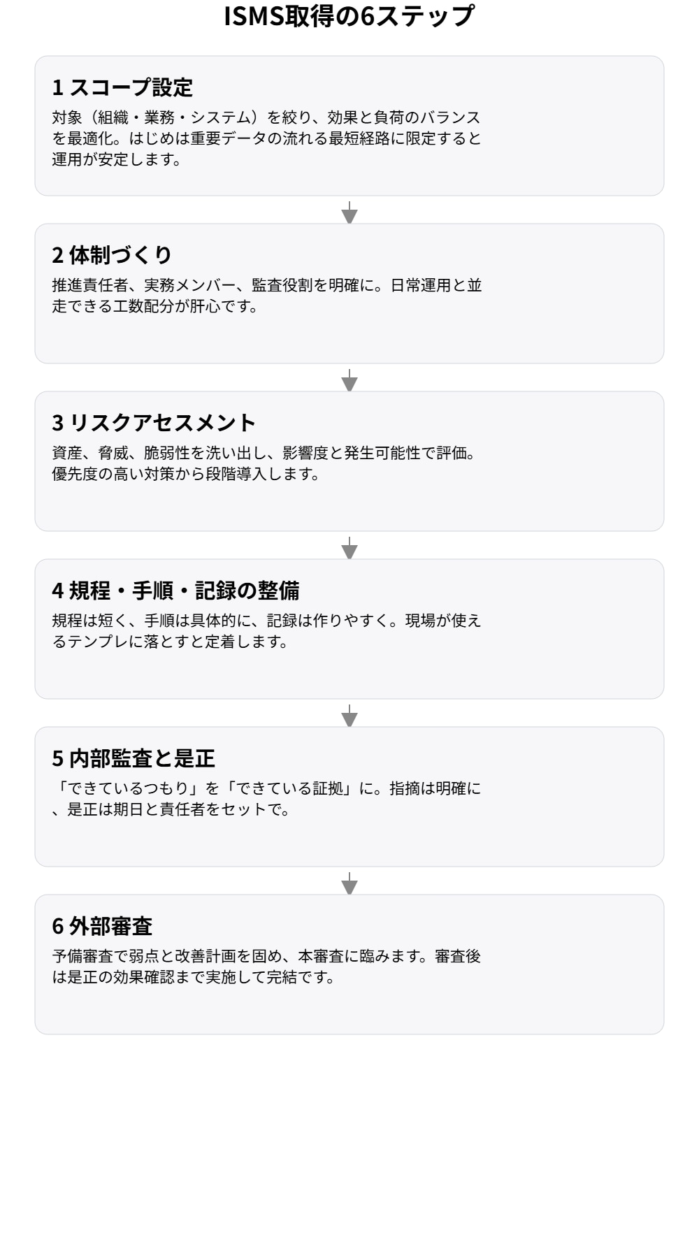 取得の流れは6ステップ(スコープ設定→体制づくり→リスク評価→規程整備→内部監査→外部審査)。 段階的に進めれば、無理なくセキュリティ基盤を整えられます。