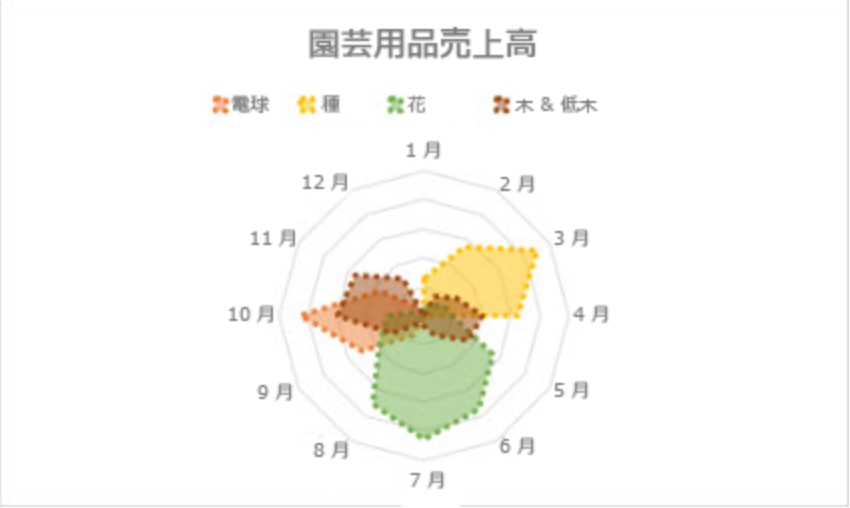 一方、項目数が多すぎると視認性が落ちるため、評価軸の選定と色の使い方に配慮が必要です。総合的な傾向分析を行いたい場合に活用できるグラフです。