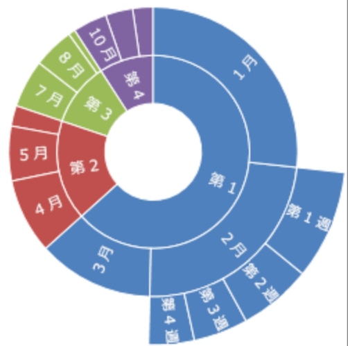 サンバーストは、階層的なデータ構造を円形で表現し、中心から外側に向かって階層を展開する形式です。