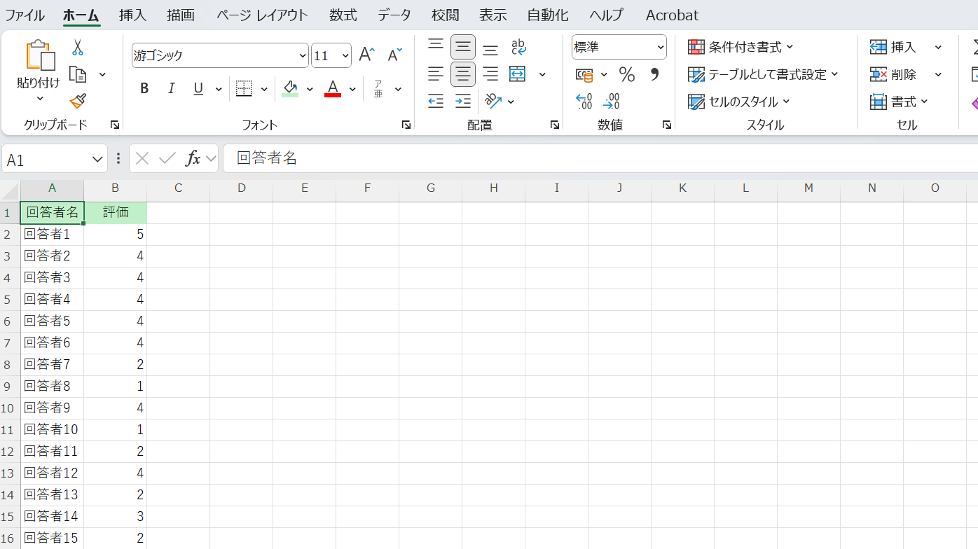 まずはアンケート結果を数字に変換して入力します。文字のままでは計算ができないため、1〜5の数字で統一することが重要です。