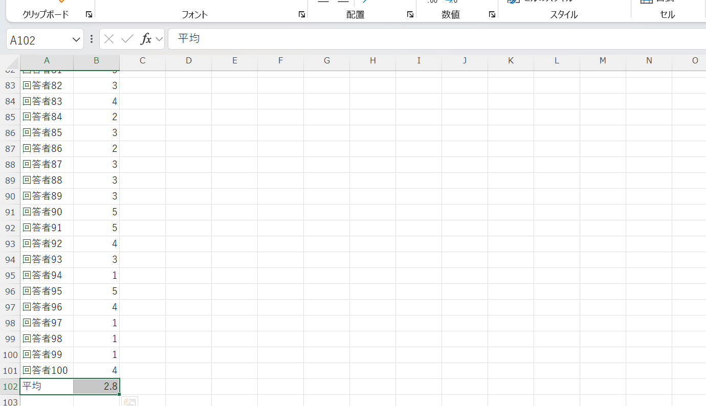 =AVERAGE(B2:B101)*B2:B101は評価データの範囲です。入力範囲を間違えると正しい値が出ないので注意しましょう。
