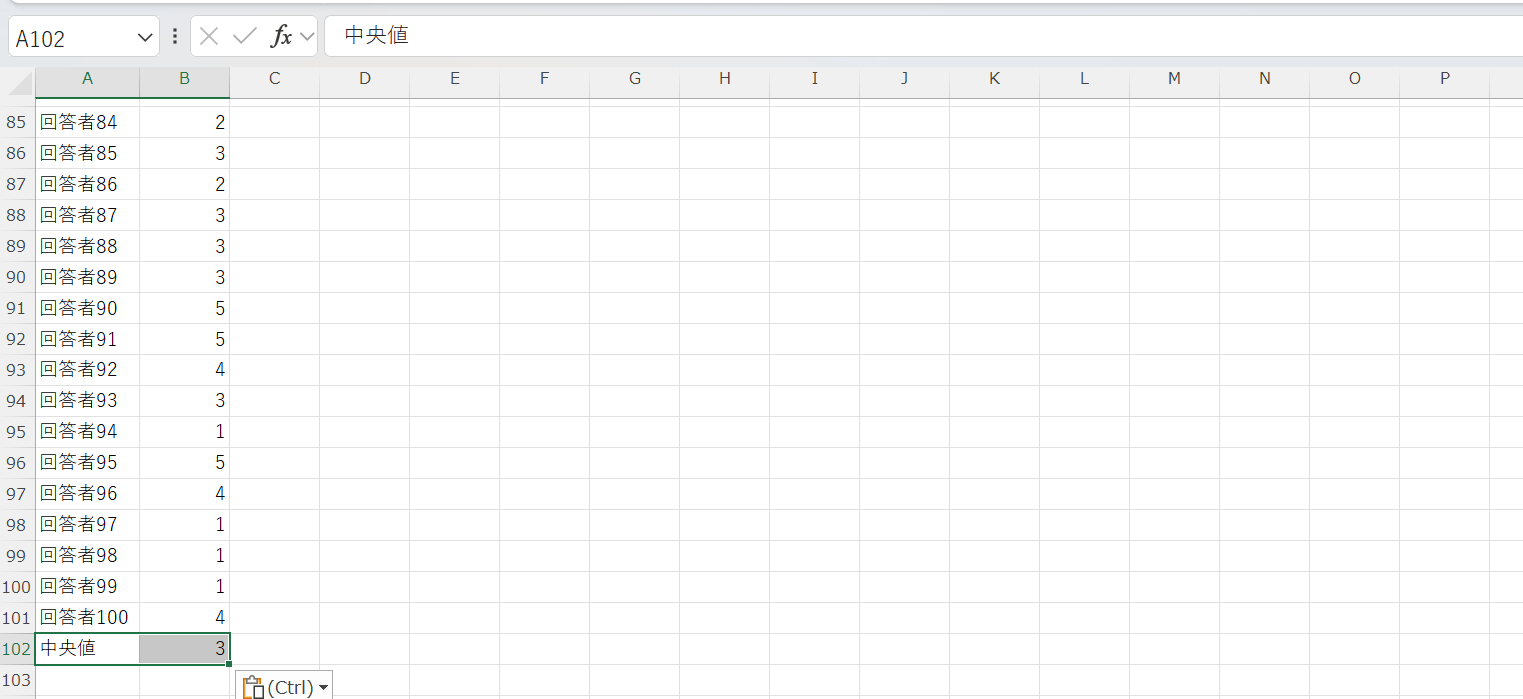 =MEDIAN(B2:B101)実務のコツとして、平均値と中央値をセットで確認すると、