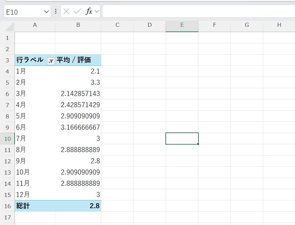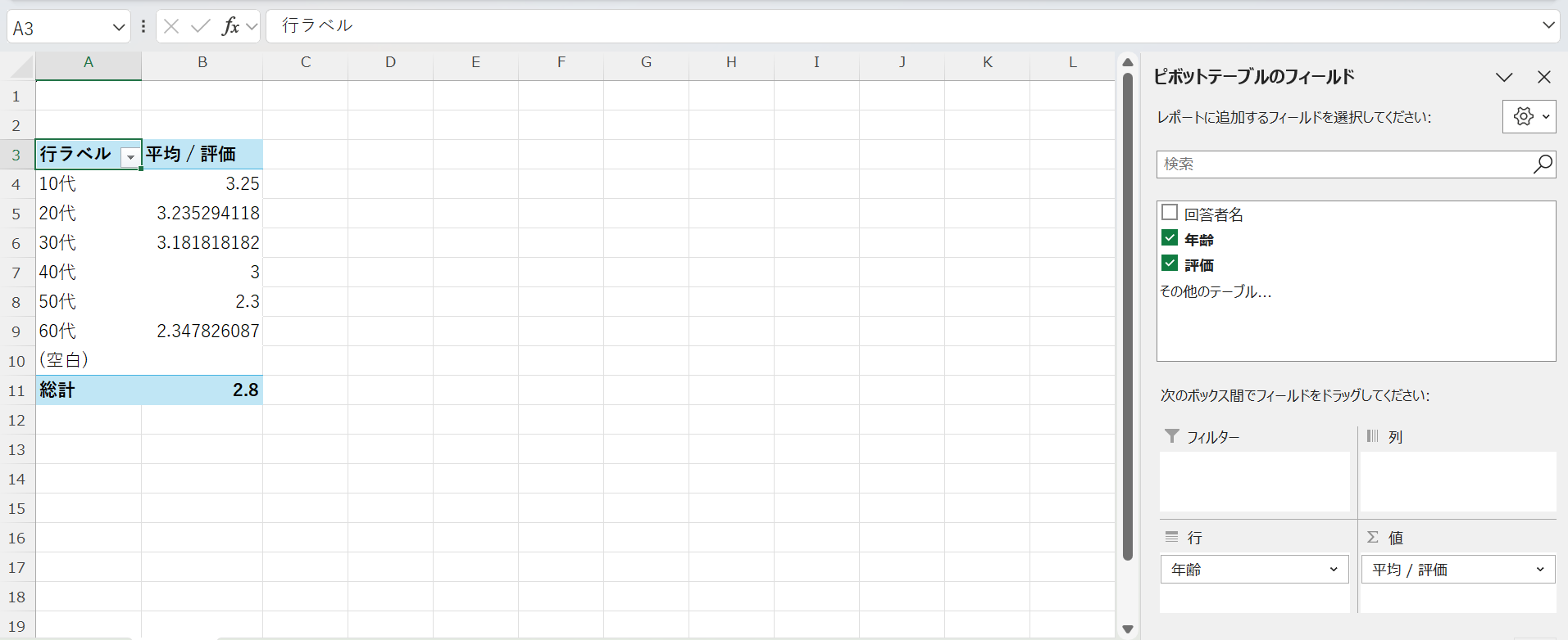 - 行ラベルに「年齢」、値に「評価(平均)」を設定