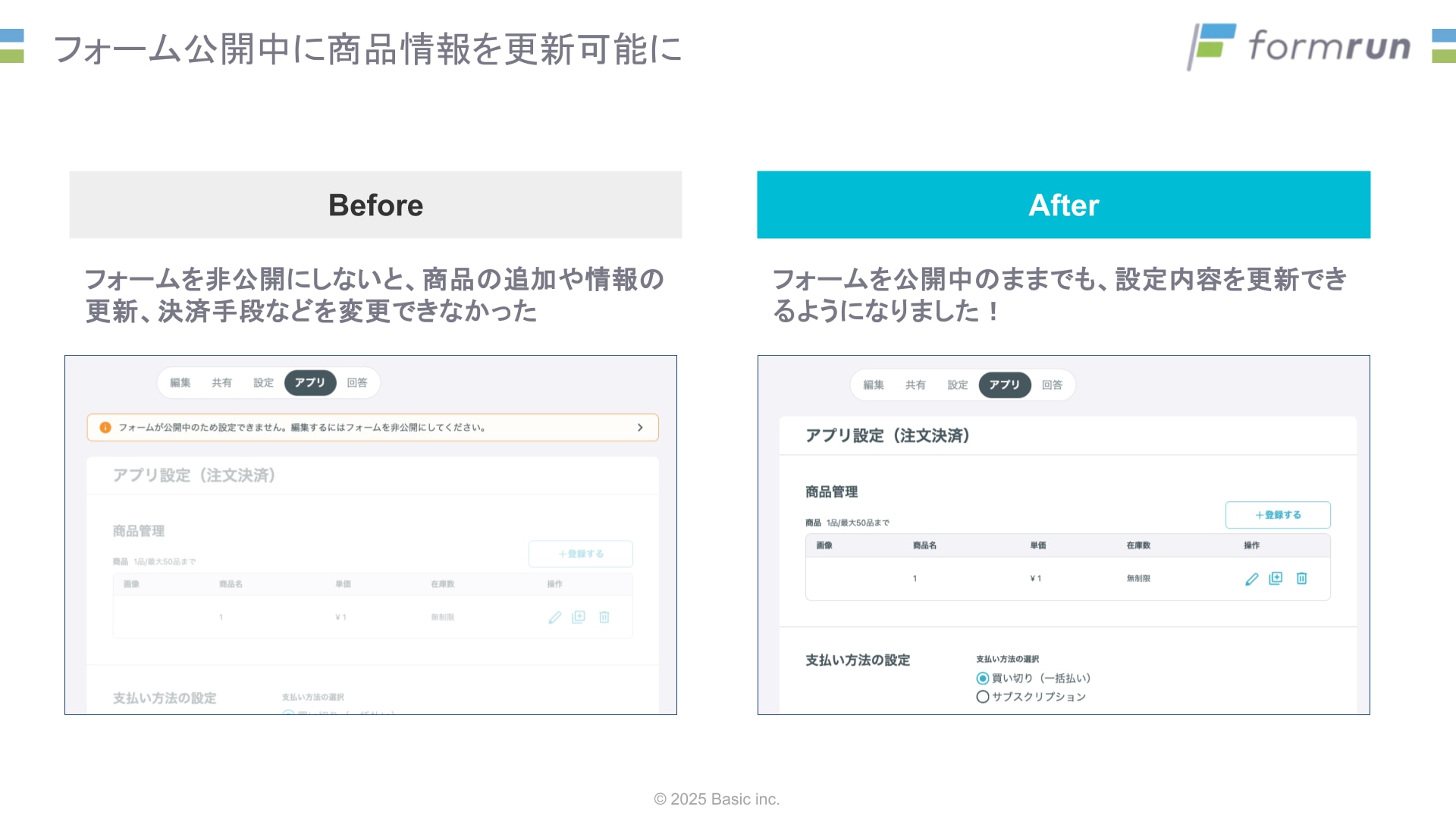 これまではフォーム公開後に商品情報を変更する場合、一度フォームを非公開にする必要がありました。今後は公開中のままでも商品や決済手段などを更新できるようになりました!