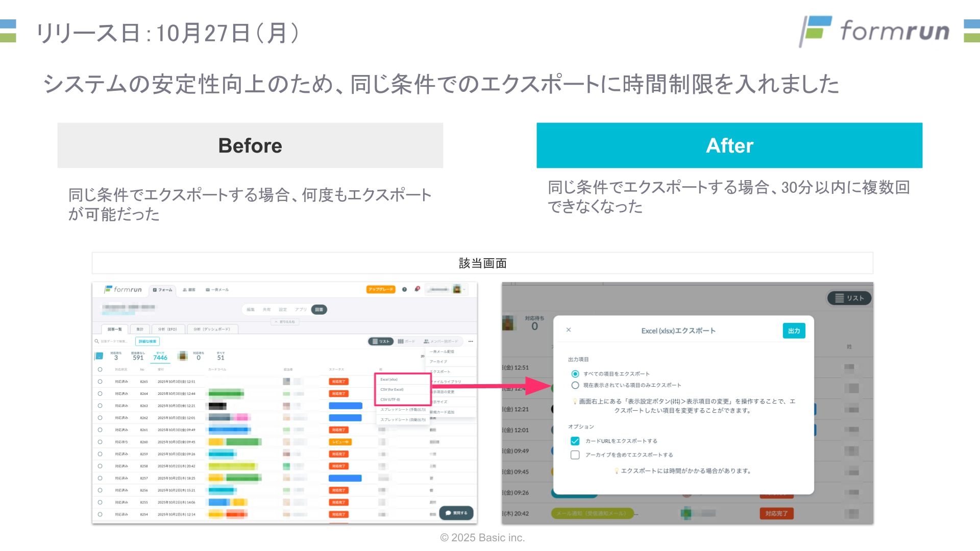 そのため、快適にご利用いただけるよう、同じユーザー・フォーム・絞り込み条件でのエクスポートは、30分以内に再度実行できないよう制限いたしました。