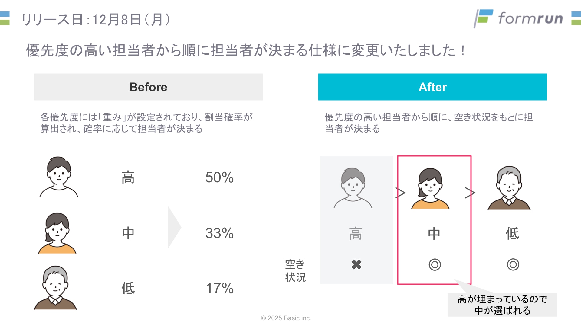 これまでは優先度に応じた「確率」で担当者が決まっていましたが、今回の変更により「優先度の高い順」に確実に割り当てられるように進化。