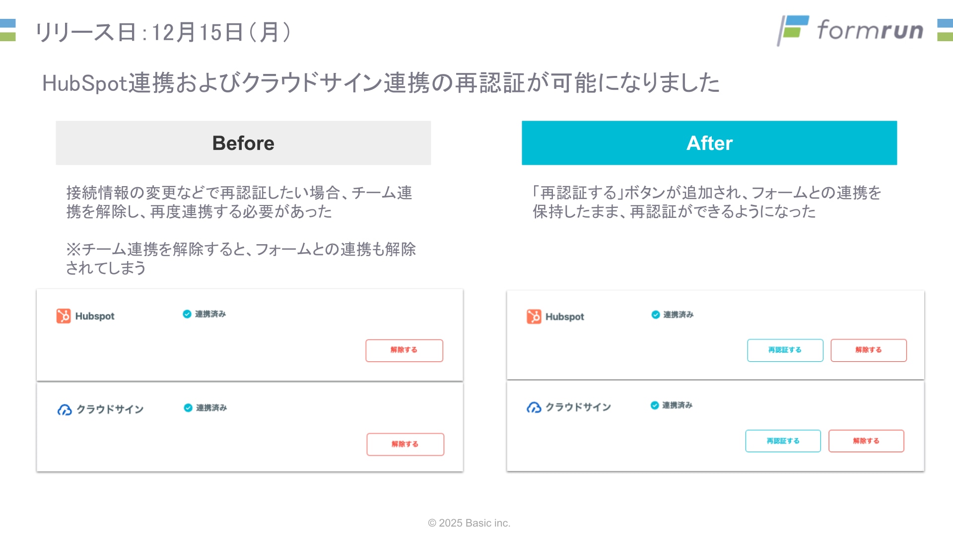 接続情報を変更したい場合、今まではチーム連携を一度解除する必要がありましたが、新たに「再認証する」ボタンが追加され、連携を保ったまま再認証できるようになりました。