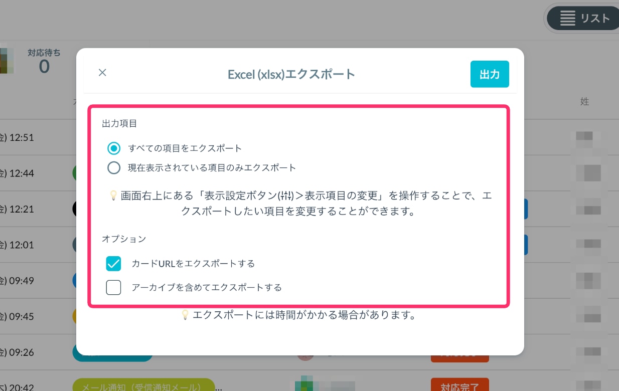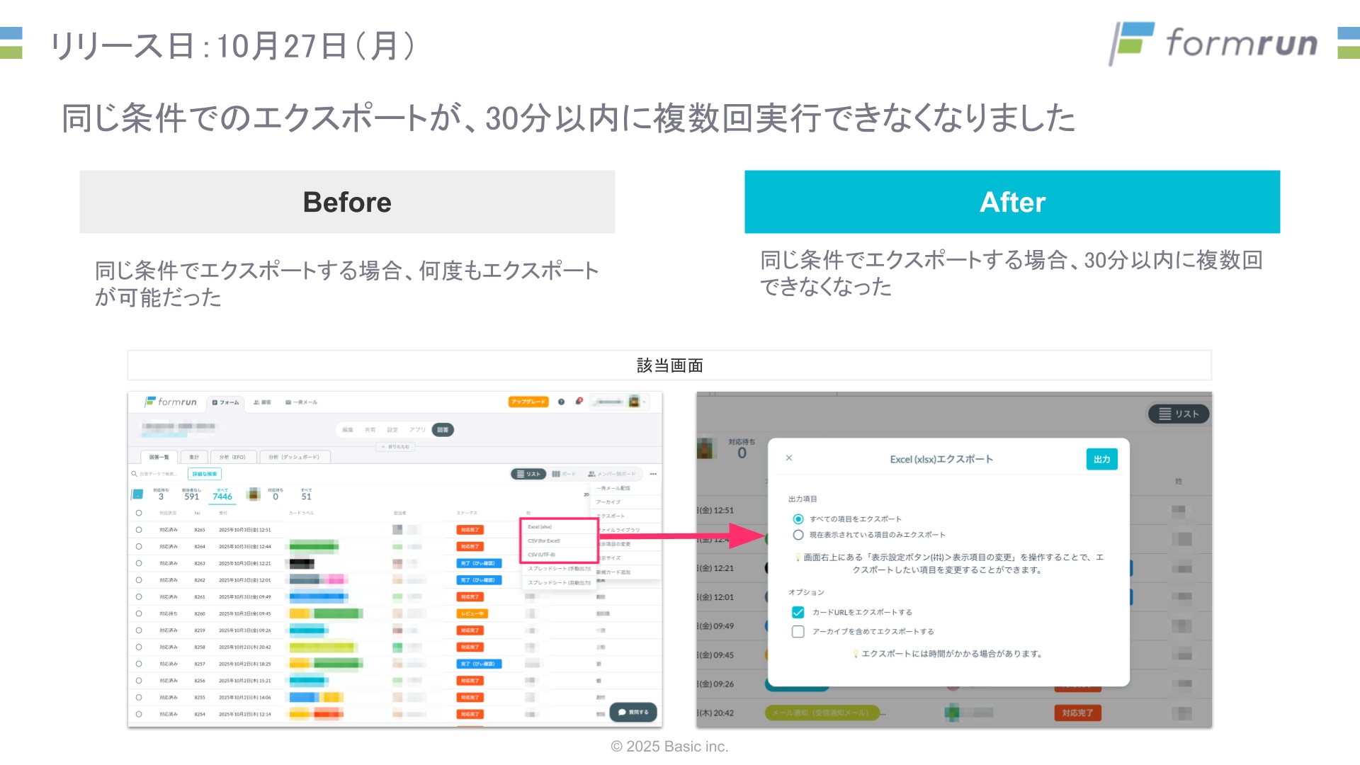 これまで、同じユーザー・フォーム・絞り込み条件でのエクスポートを何度でも実行可能でしたが、30分以内に同一条件でのエクスポートを複数回実行することができなくなりました。