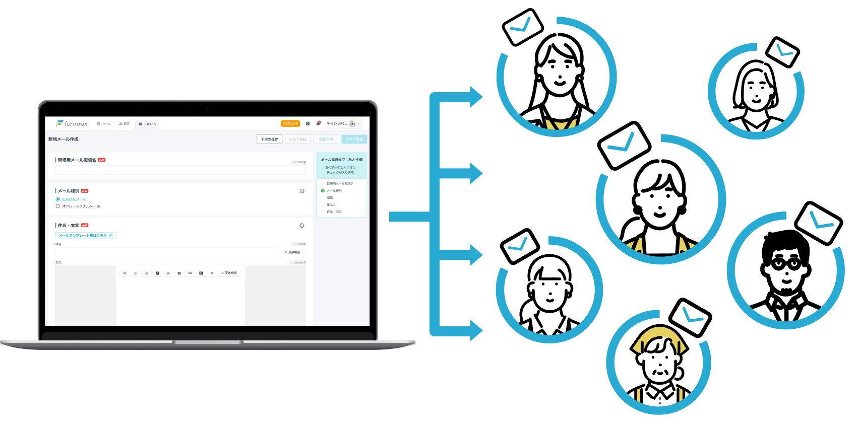 一斉メール配信機能とは、フォーム経由で獲得した顧客や、CSVでインポートした顧客に対して、メールを配信できる機能です。