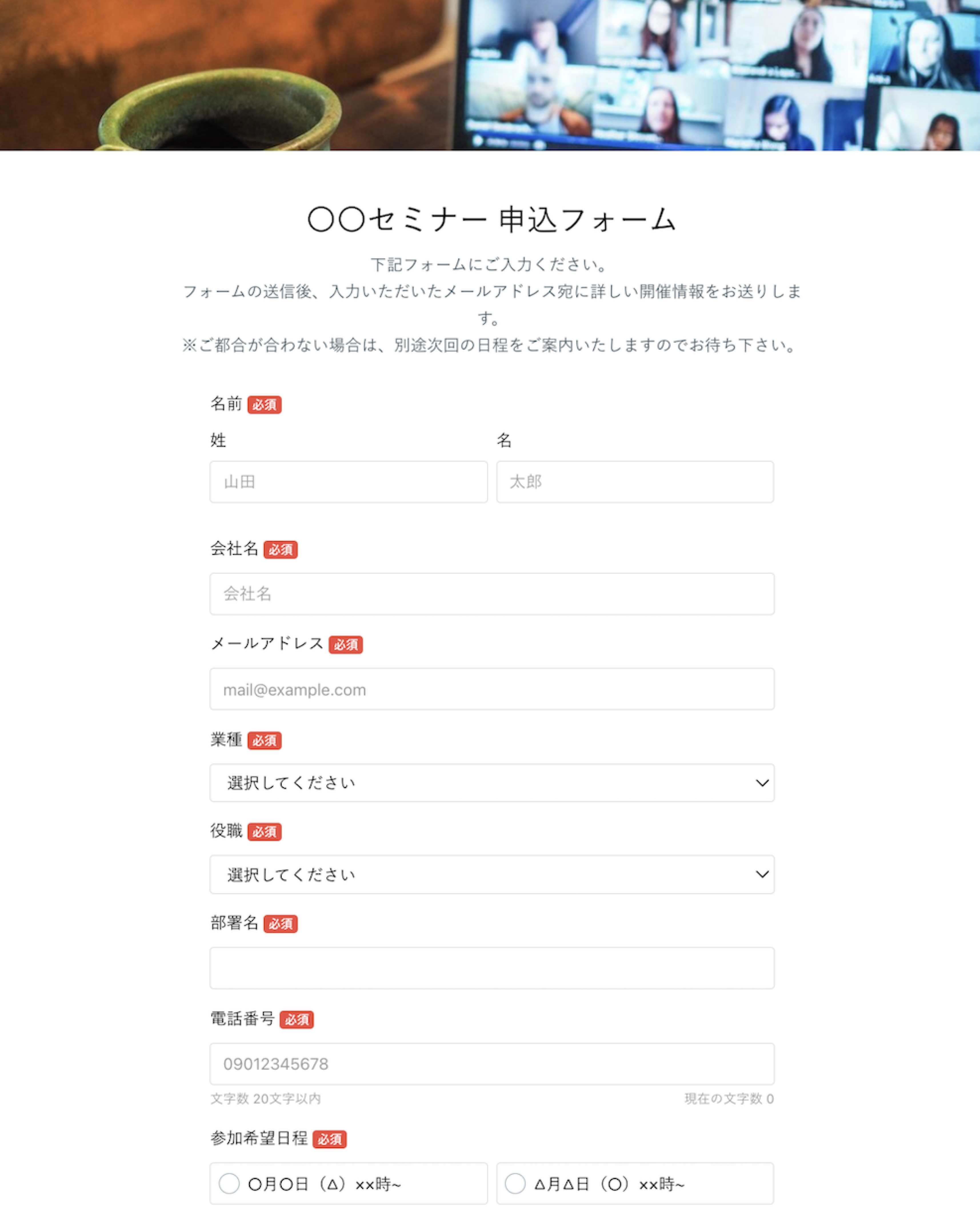 「formrun」のイベント申し込みフォームテンプレートを利用すれば、簡単にイベント申し込みフォームを作成することができます。 豊富な種類の中から「イベント・セミナーの参加受付」や「参加者情報入力フォーム」など、多様な利用用途に対応したテンプレートを選択することが可能です。 formrunのフォームでイベント申し込みフォームを作成してみましょう!
