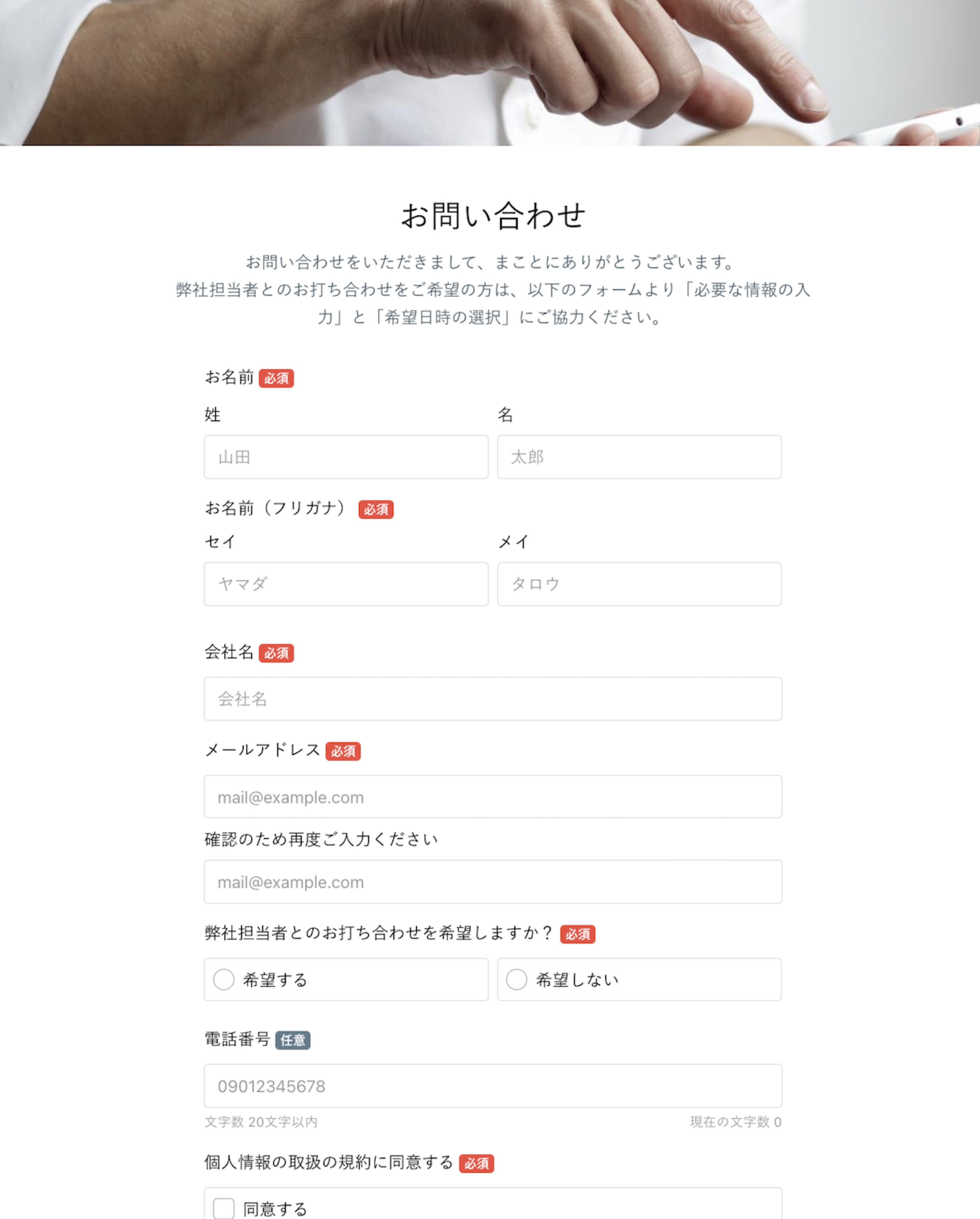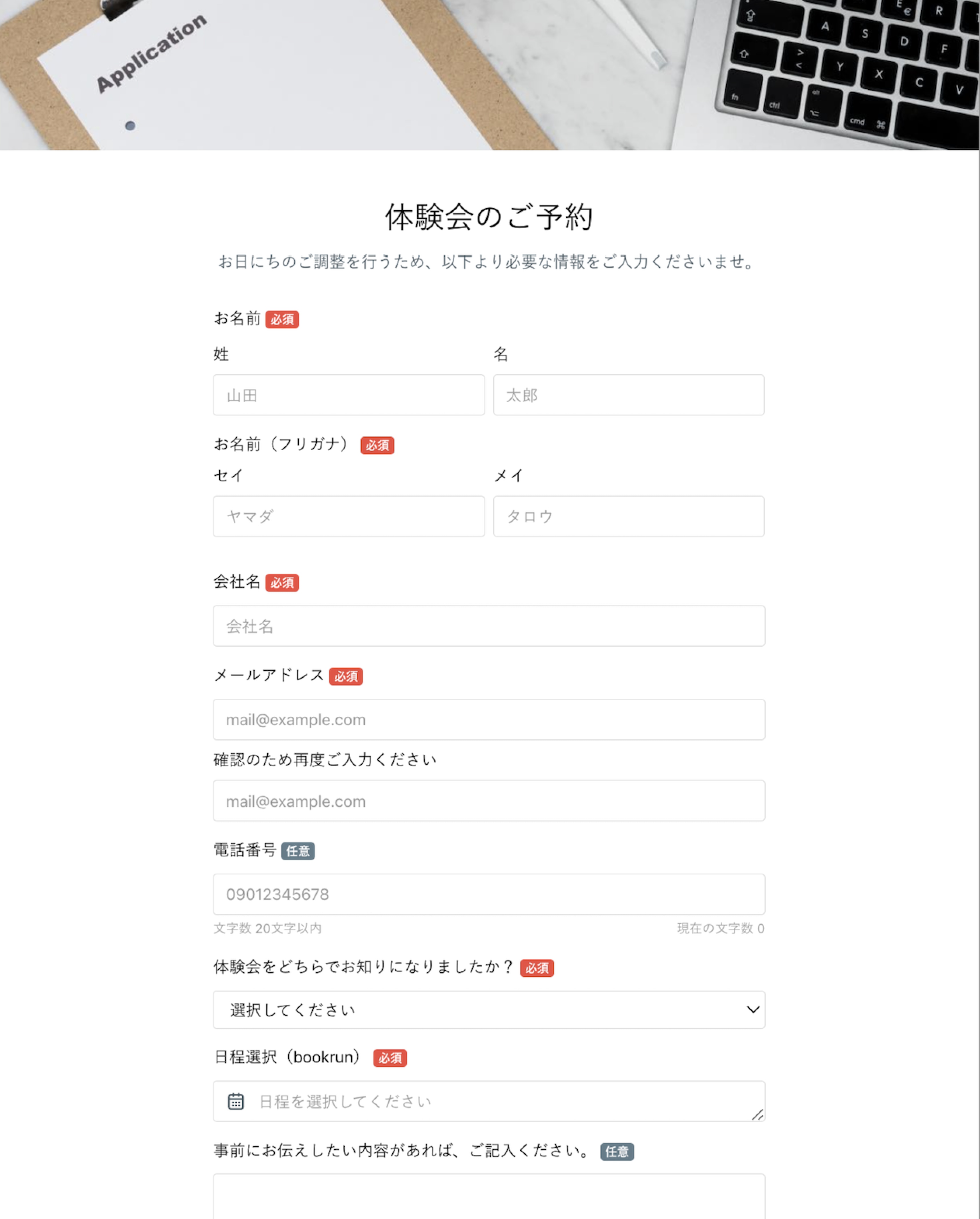 「formrun」の予約・申し込みフォームテンプレートを利用すれば、簡単に予約フォーム・申し込みフォームを作成することができます。 豊富な種類の中から「商品販売予約フォーム」や「体験会予約」など、多様な利用用途に対応したテンプレートを選択することが可能です。 formrunのフォームで予約フォームや、申し込みフォームを作成してみましょう!