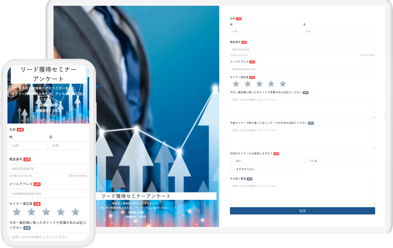 アンケートでよく使われるフォーム項目も多数ご用意しています。回答によって設問を分岐できる条件分岐項目や、同じ回答選択肢を繰り替える際に便利なマトリクス選択項目。満足度調査時に使える評価ボタンも。追加の開発等は一切かからず、項目をドラッグ&ドロップでセットするだけでフォームが出来上がります。