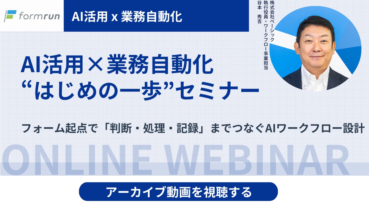 | タイトル | AI×業務自動化“はじめの一歩”セミナー:フォーム起点で「判断・処理・記録」までつなぐAIワークフロー設計 |