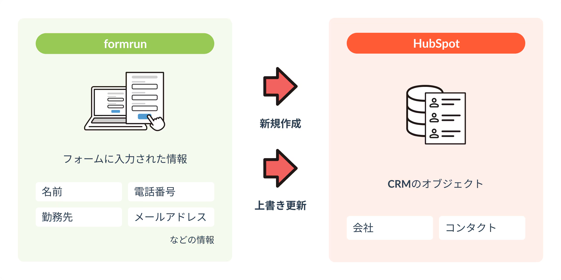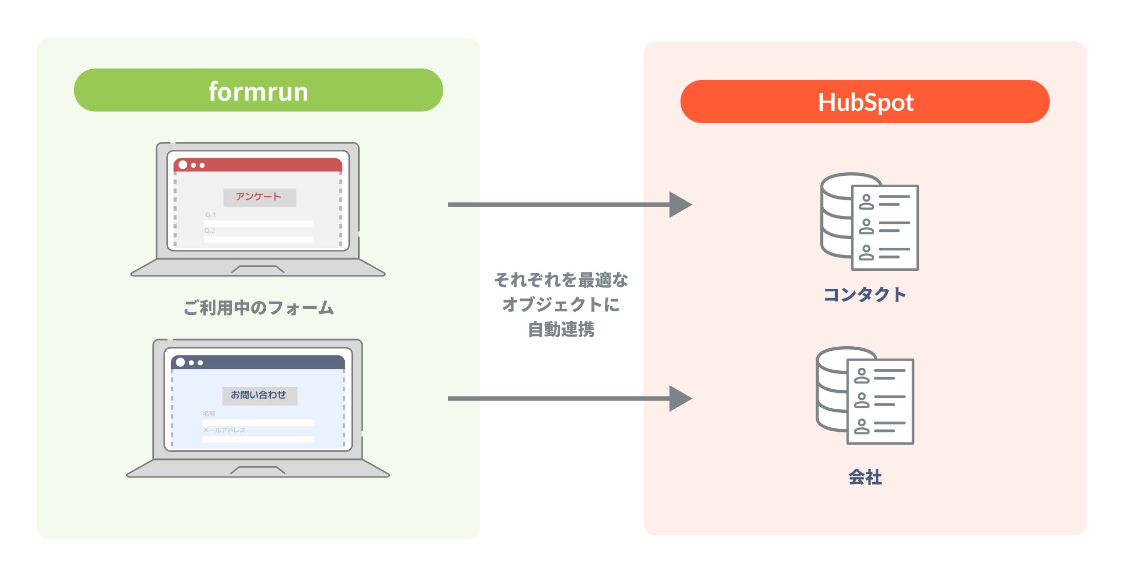 formrunで得た回答データはHubSpotのコンタクトや会社のレコードと自動的に連携できます。