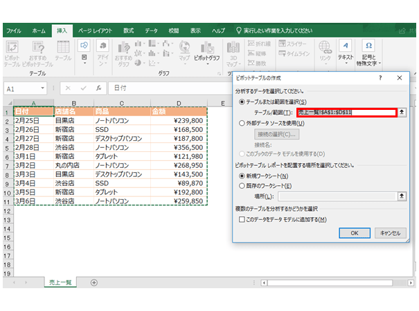 選択されたデータの範囲が間違っていないかを確認し、新規ワークシートにチェックが入っていることを確認して【OK】をクリックします。