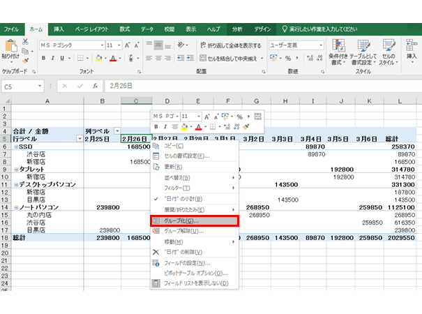 日付の入ったセルを選択して右クリックし、【グループ化】をクリックします。