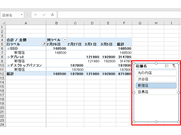 上記のピボットテーブルでは商品名と店舗名が同じ列に収まっています。