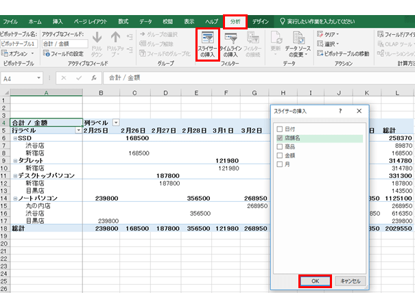 まず、【分析】タブをクリックし、【スライサーの挿入】を選択すると小窓が出てきます。抽出したいデータの項目にチェックを付けて【OK】をクリックすればスライサーが出てきます。