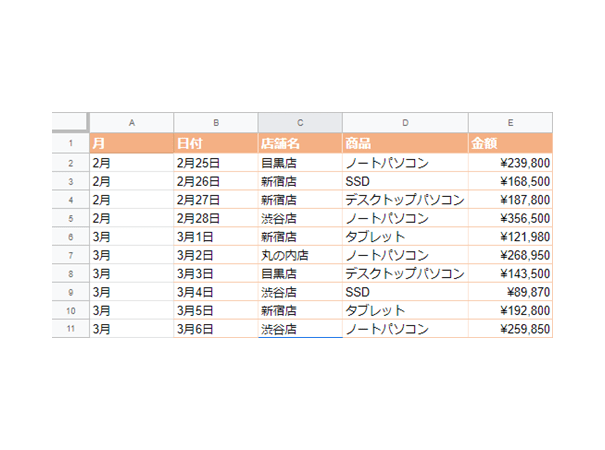 まずはExcelのシートに日付・店舗名・商品・金額など必要なデータを入力します。