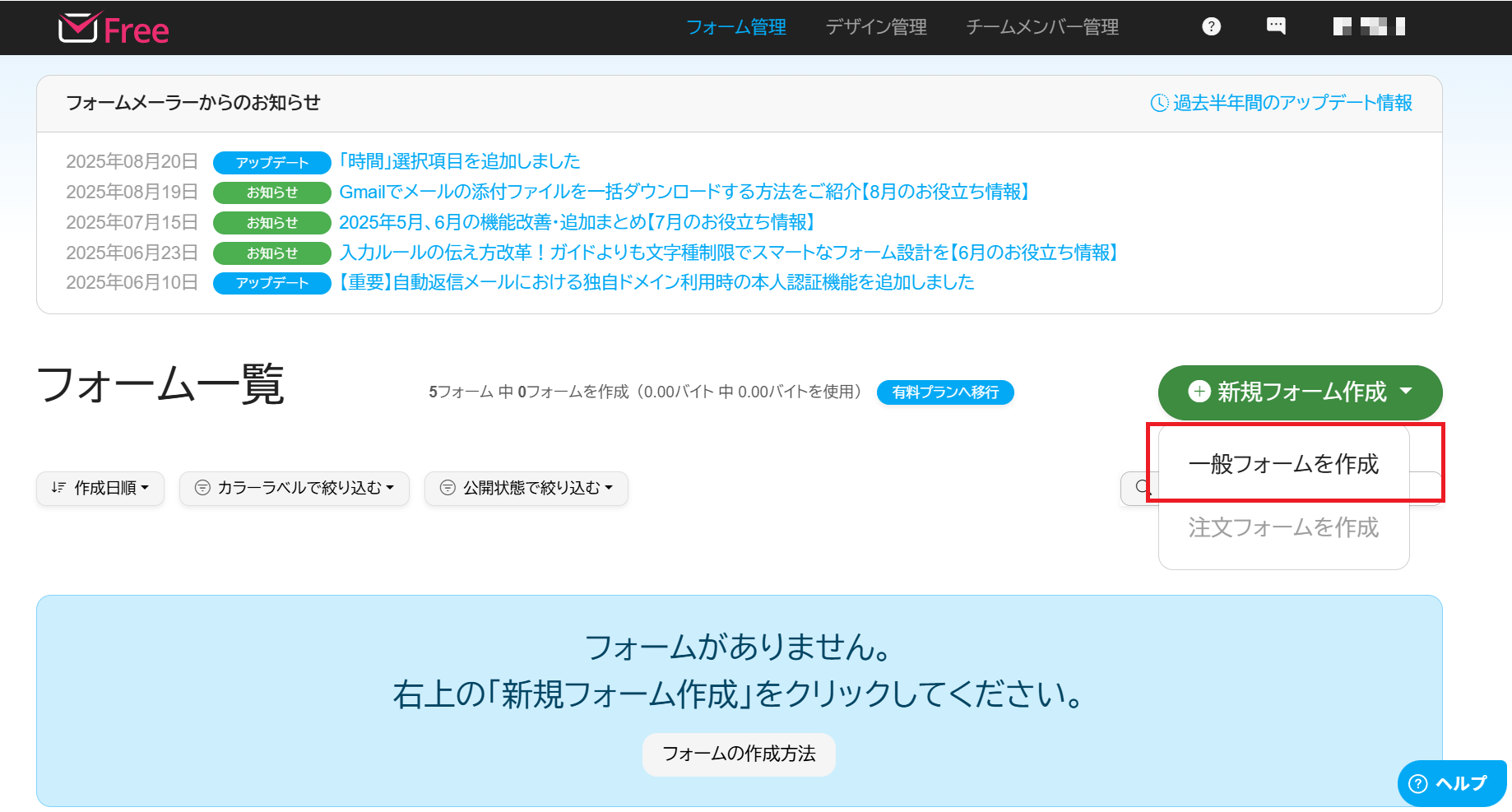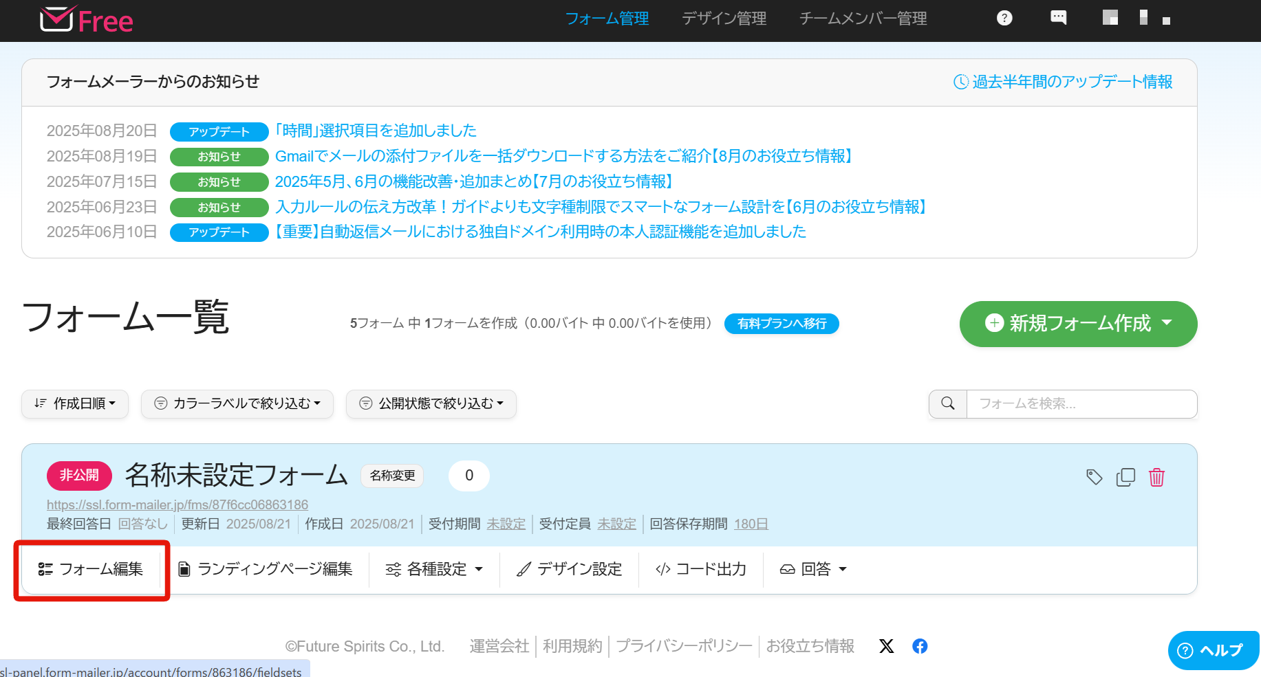 無料プランで作成できるフォーム数5個1個無制限