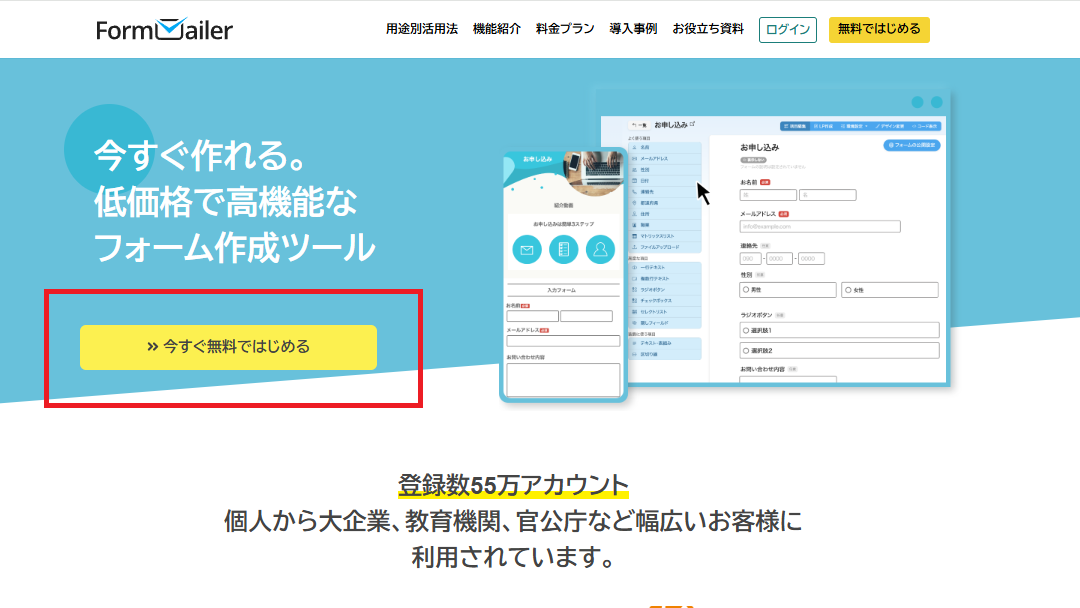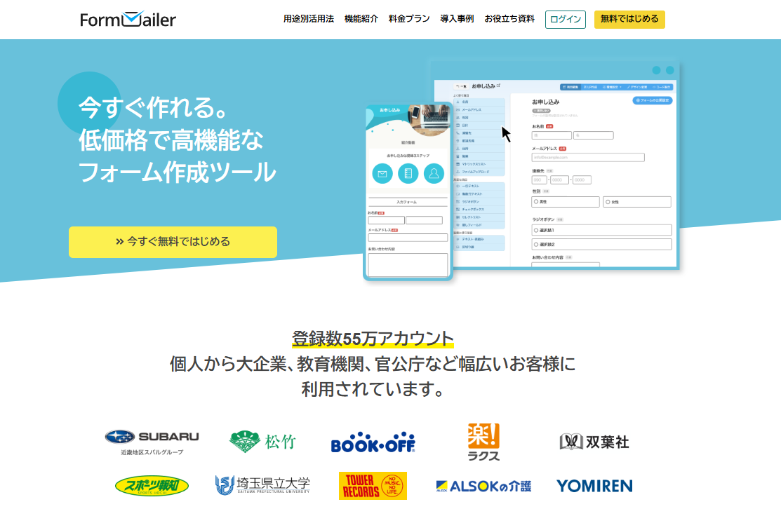 Formmailerでは、フォームやLP(ランディングページ)を作成することができます。(※LPは有料プランのみ)