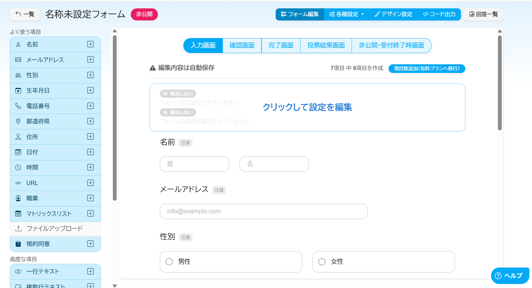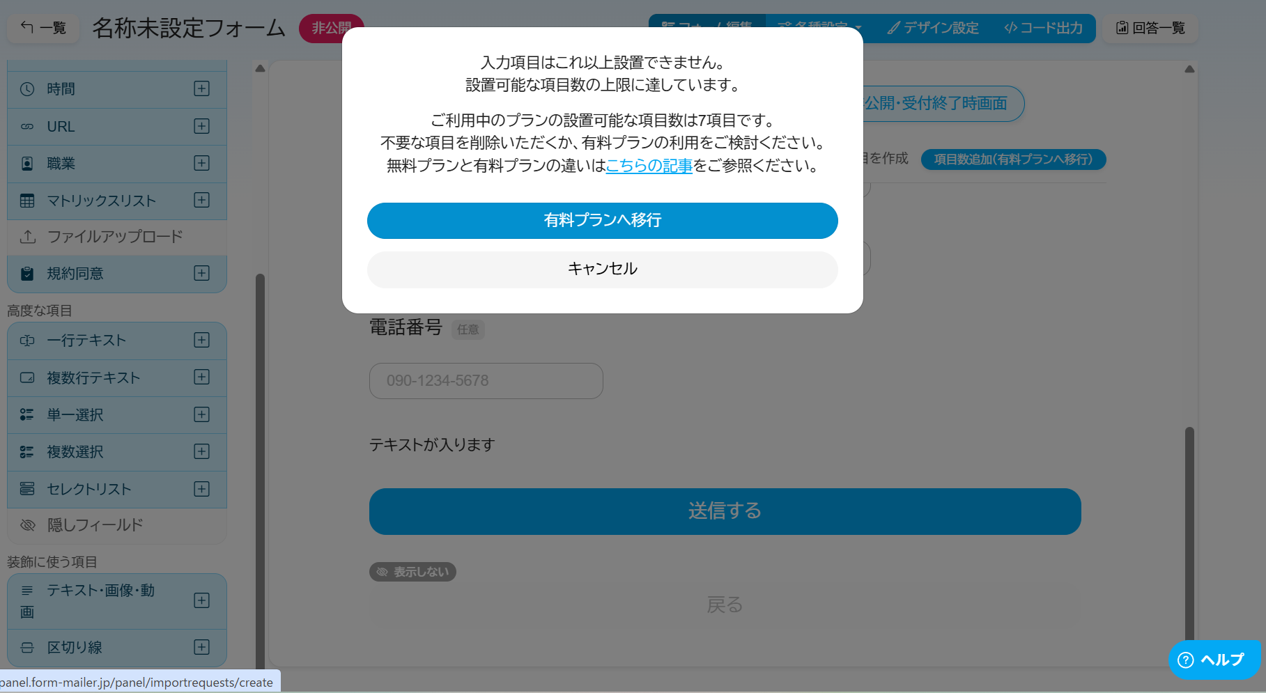 フォーム項目数(無料プラン)7項目まで基本項目は利用可10項目まで
