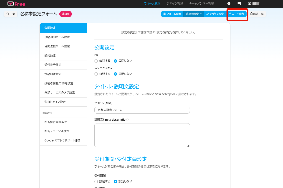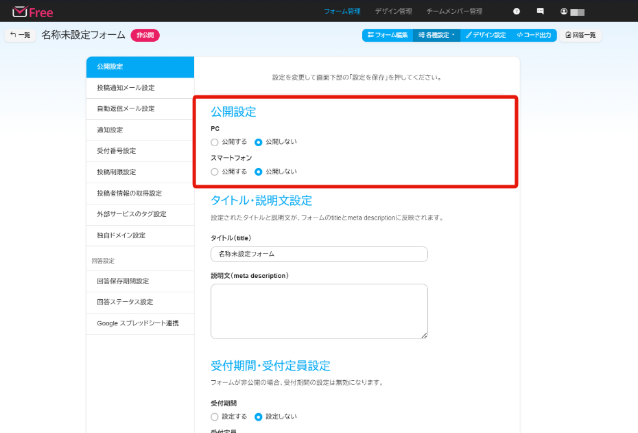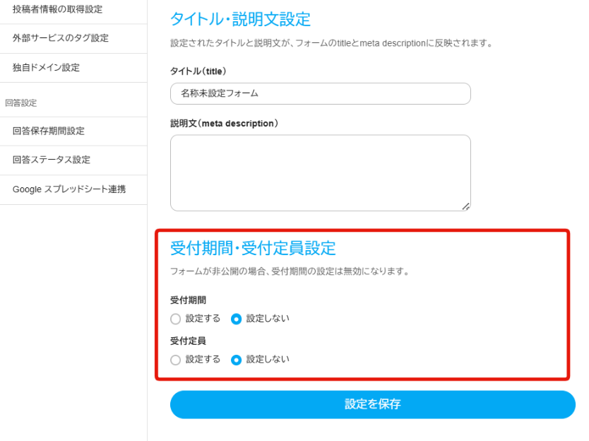 フォームの受付期間/人数が設定可能
