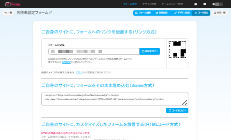 フォームの設置は、【URLリンク】【埋め込みコード(iframe)】【HTMLコード】の3種類がありますので、自社のWebサイトやWordPressで作成した個人ページなどフォームを貼りつけたい場所に応じて使い分けましょう。また、携帯電話での回答を受け付ける場合、QRコードの利用も可能です。