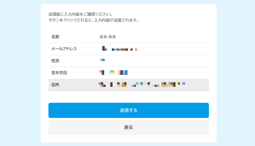 全ての項目を入力後、【確認画面へ】をクリックすると、下記のように表示されます。