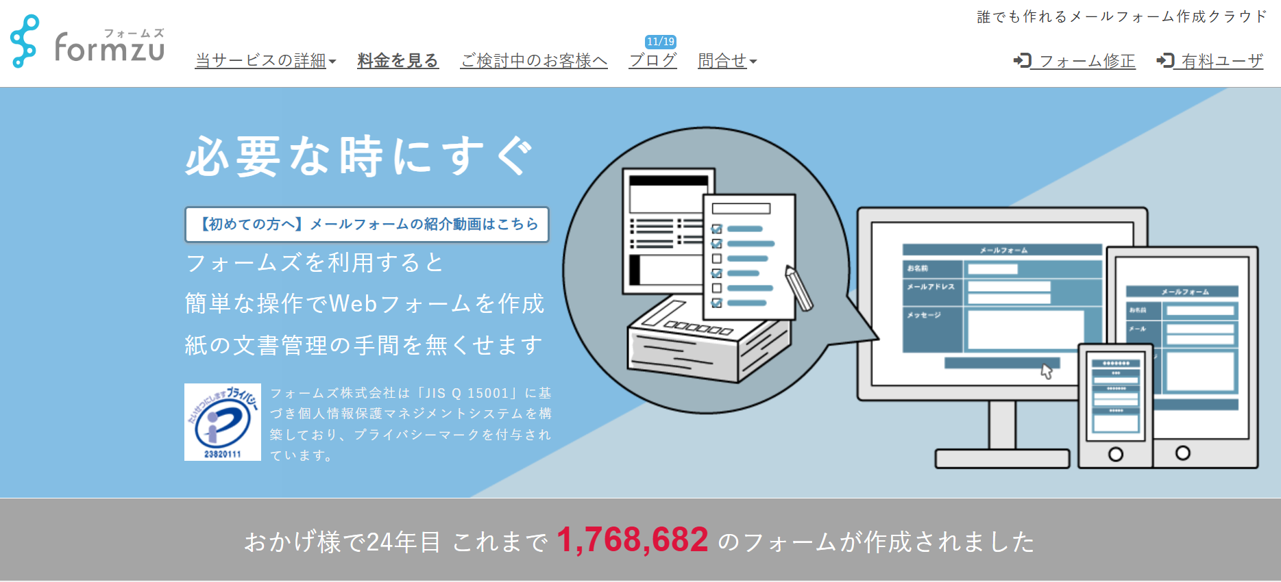 Formmailerと似たサービスの1つに「フォームズ」があります。こちらもFormmailer同様、メールフォームを簡単に作成できるツールです。