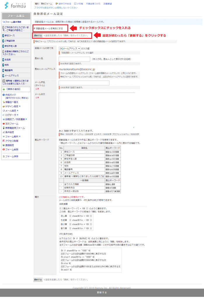 自動返信メール投稿時、投稿者へ自動的に返信メールを送信