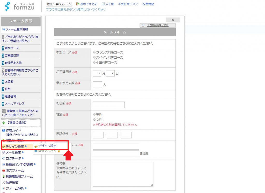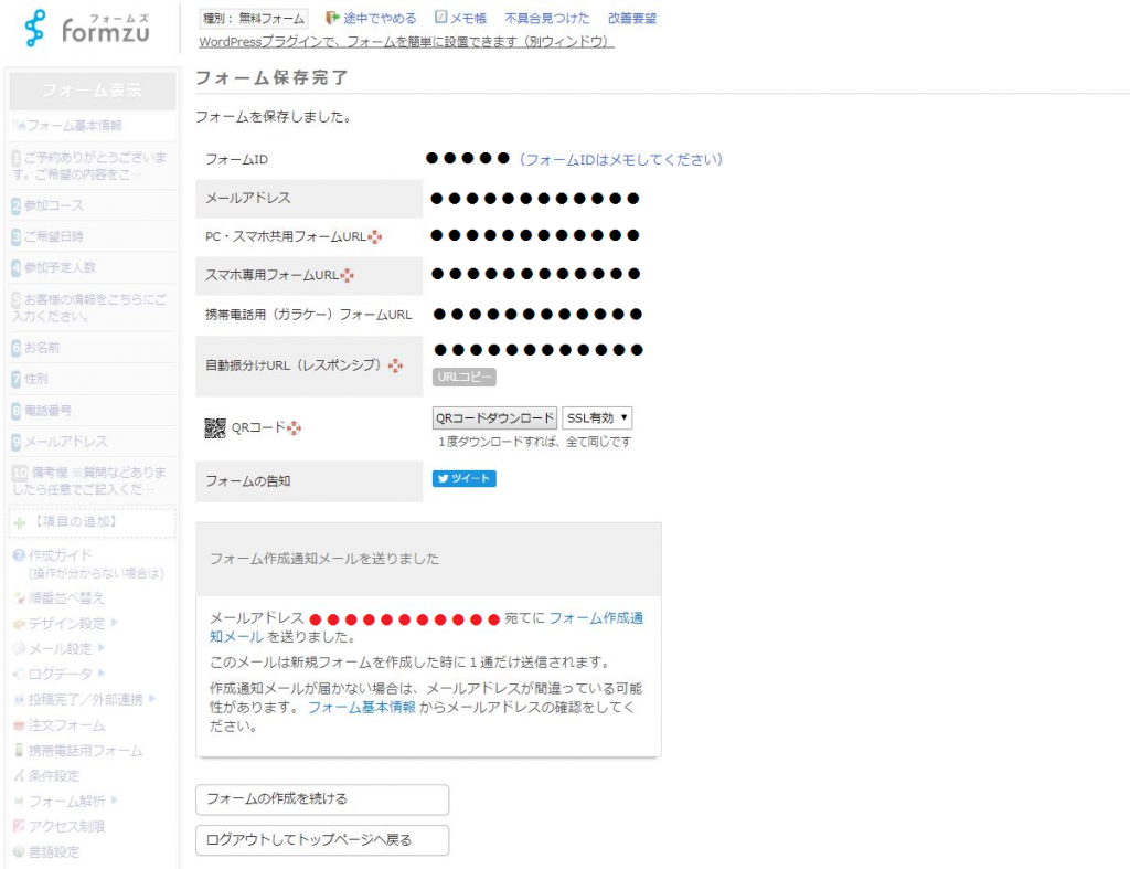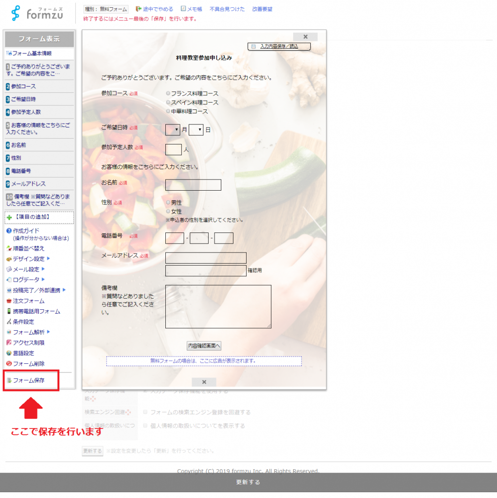 レイアウトの確認が完了したら、左側メインメニューの1番下にある「フォーム保存」をクリックします。