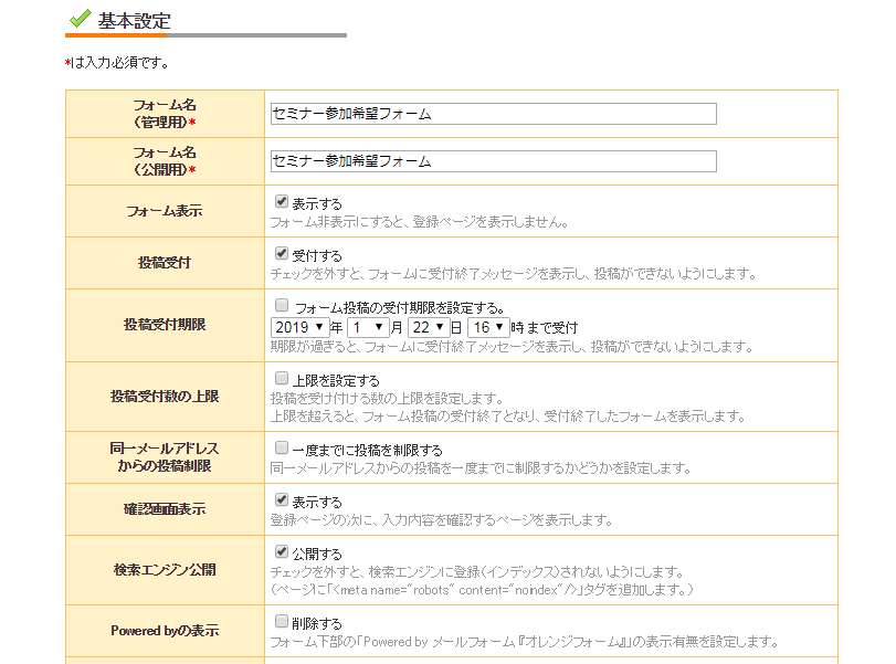 また、基本設定の【編集】をクリックすると、フォーム作成時よりも細かい設定を行うことが可能です。