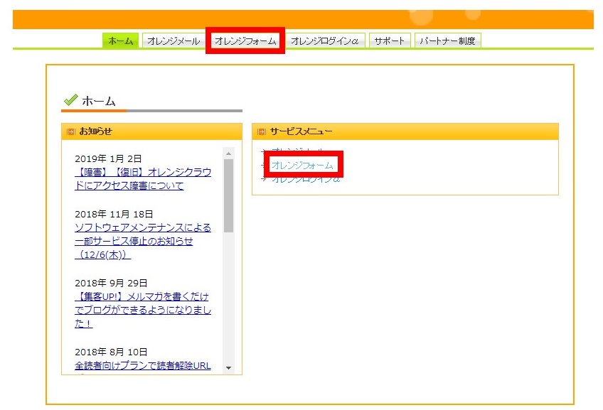 メール以外からであれば、オレンジフォームの公式サイトのTOPページ右上からログインできます。