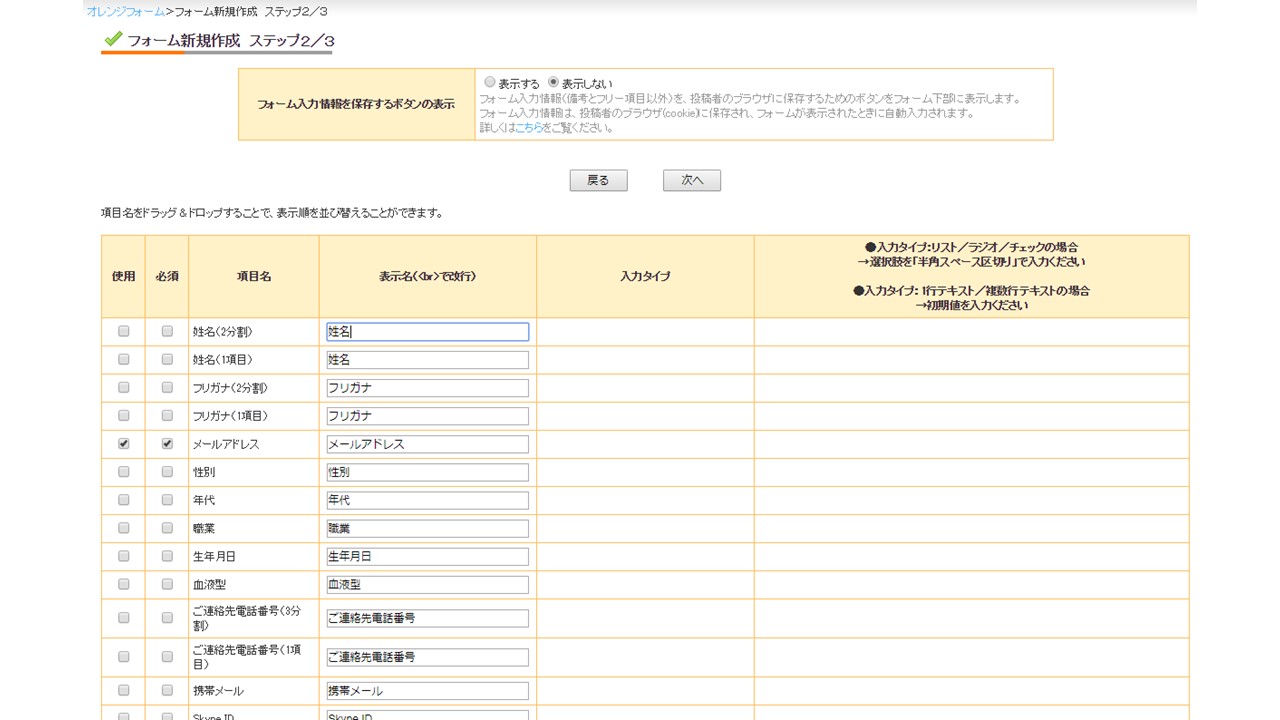よく利用される名前やメールアドレス、職業などはあらかじめフォーム内に設定されています。追加したい項目があれば左側にある「使用」にチェックを入れましょう。併せて「必須」の設定もできますので、必ず回答がほしい項目にチェックを入れてください。