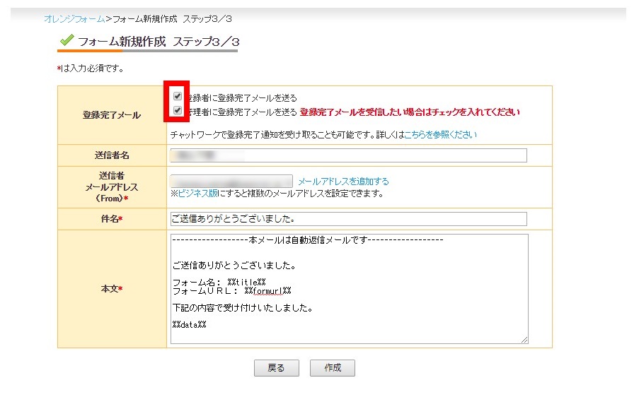 の2種類のチェックボックスがありますので、自動返信メールを送りたい方、回答があったことを自分のアドレスに通知させたい方はここで選択しておきましょう。