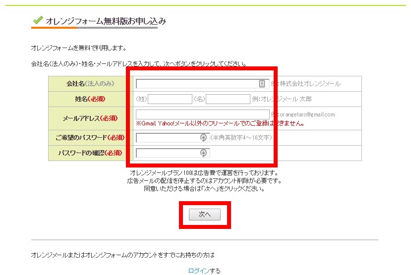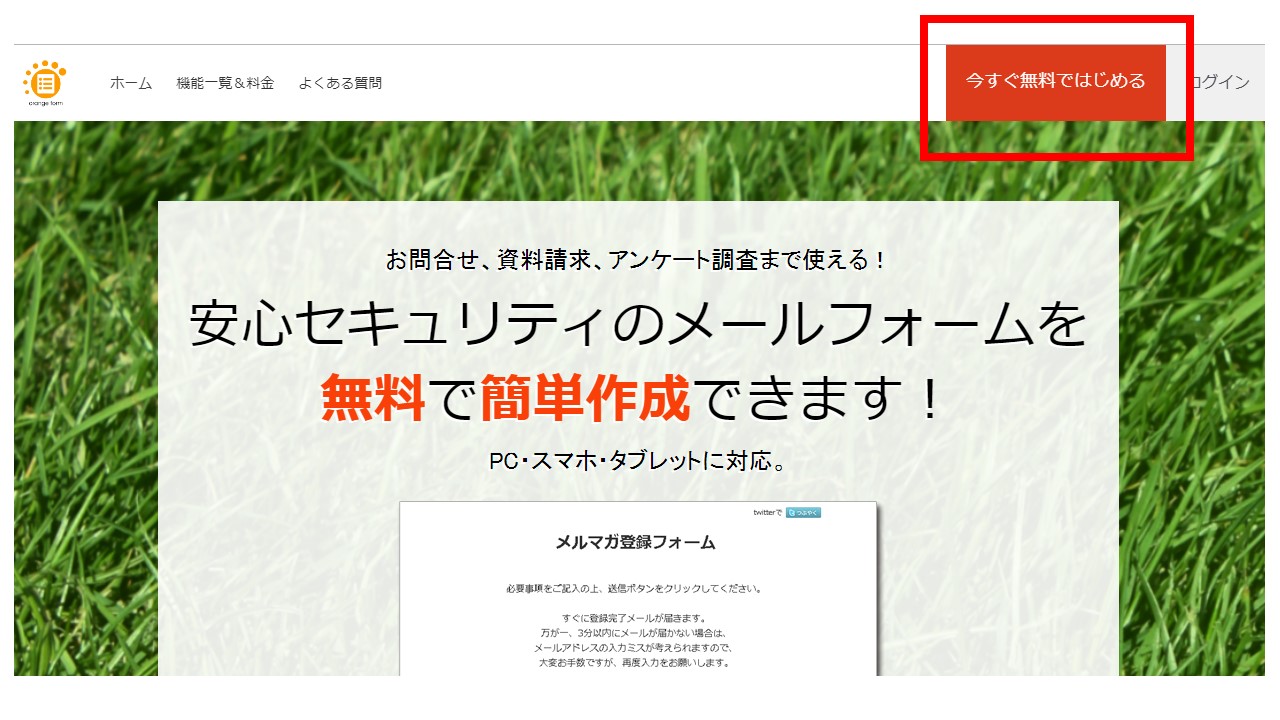 まずオレンジフォームの公式サイト右上にある【今すぐ無料ではじめる】をクリック。