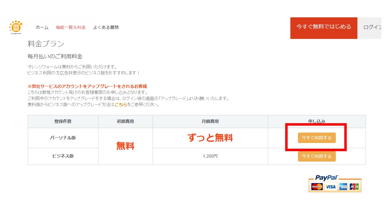 オレンジフォームで用意されているプランは無料のパーソナル版と有料のビジネス版の2種類。