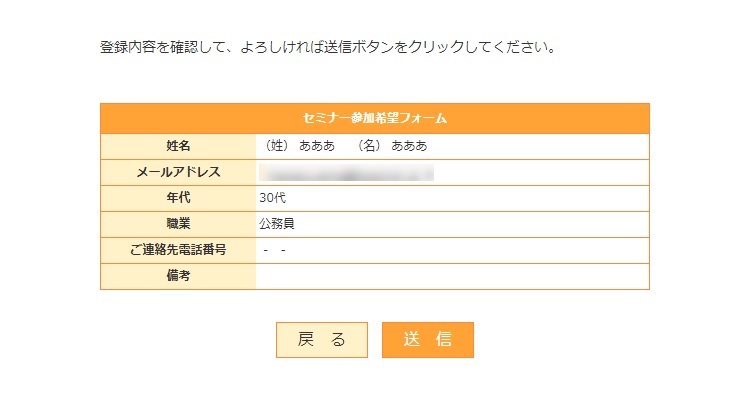 回答が完了すると、確認画面に移ります。【送信】をクリックし、登録アドレスに自動返信メールが届いたか確認しましょう。