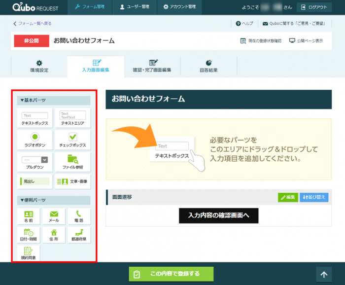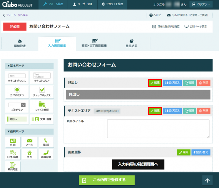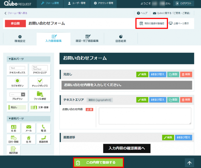 必要なパーツの追加・編集が完了したら、【この内容で登録する】をクリックすると保存できます。