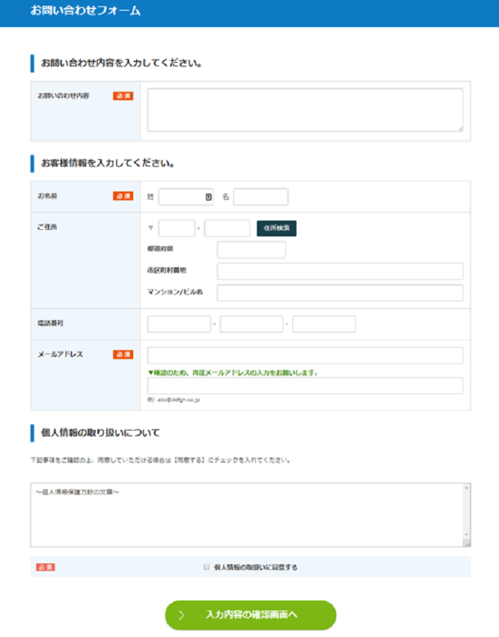 次のページで必要事項を入力し、【入力内容の確認画面へ】をクリックすると確認画面が表示されるので、内容を確認して【この内容で送信する】をクリックします。