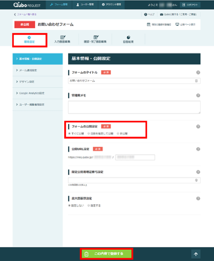 また、公開前には管理者メモや公開URL、限定公開用暗証番号、最大回答数の設定も可能です。