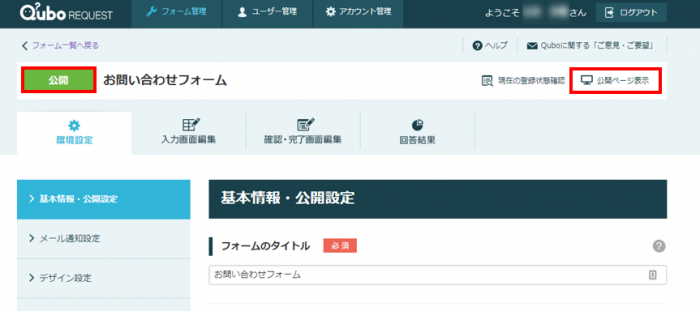 作成したフォームが公開されると、左上に表示されているステータスが非公開から【公開】に変わります。
