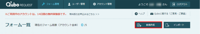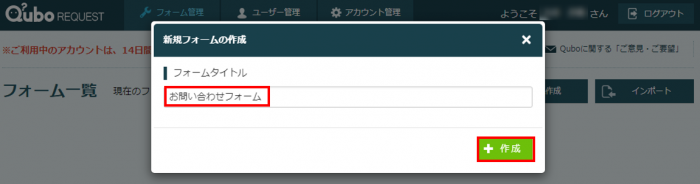 ログイン後の管理画面に表示されている、フォーム一覧ページ右上の【新規作成】をクリックすると、フォームタイトルを入力する画面が立ち上がります。
