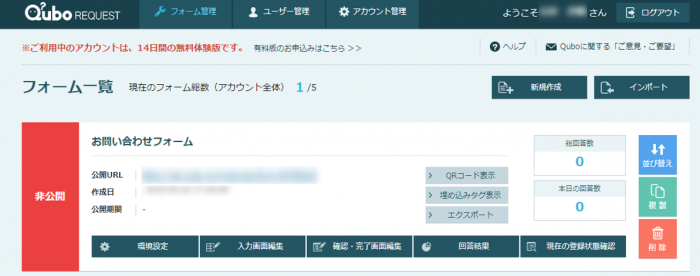 作成したいフォーム名を入力して【+作成】をクリックします。新規作成が完了し、下記フォーム一覧ページに表示されます。