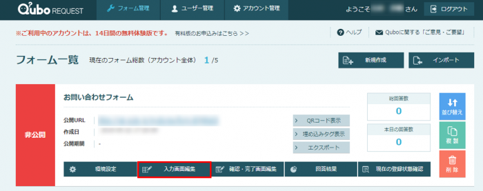 入力画面を作成するには、まず該当のフォームの【入力画面編集】をクリックします。
